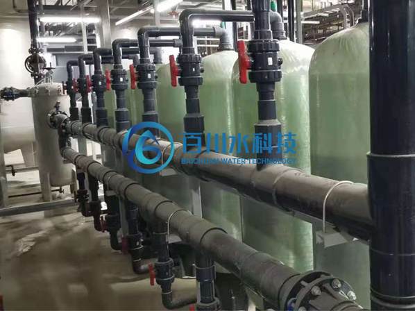 2、預處理→一級反滲透→加藥機(PH調節)→中間水箱→第二級反滲透(正電荷反滲膜)→純水箱→純水泵→EDI裝置→紫外線殺菌器→精密過濾器→用水對象(≥17MΩ.CM)(最新工藝)